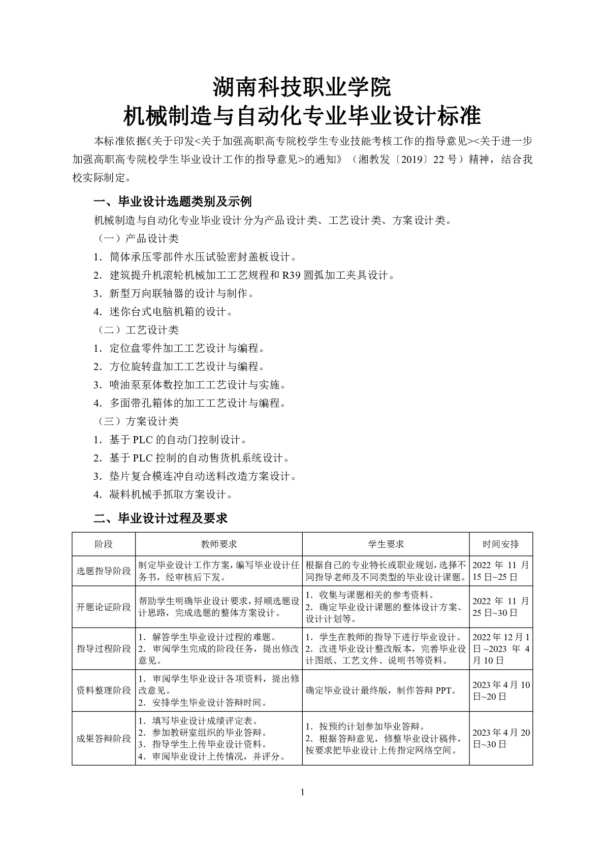 智能装备技术学院机械制造与自动化专业毕业设计标准(2023届)