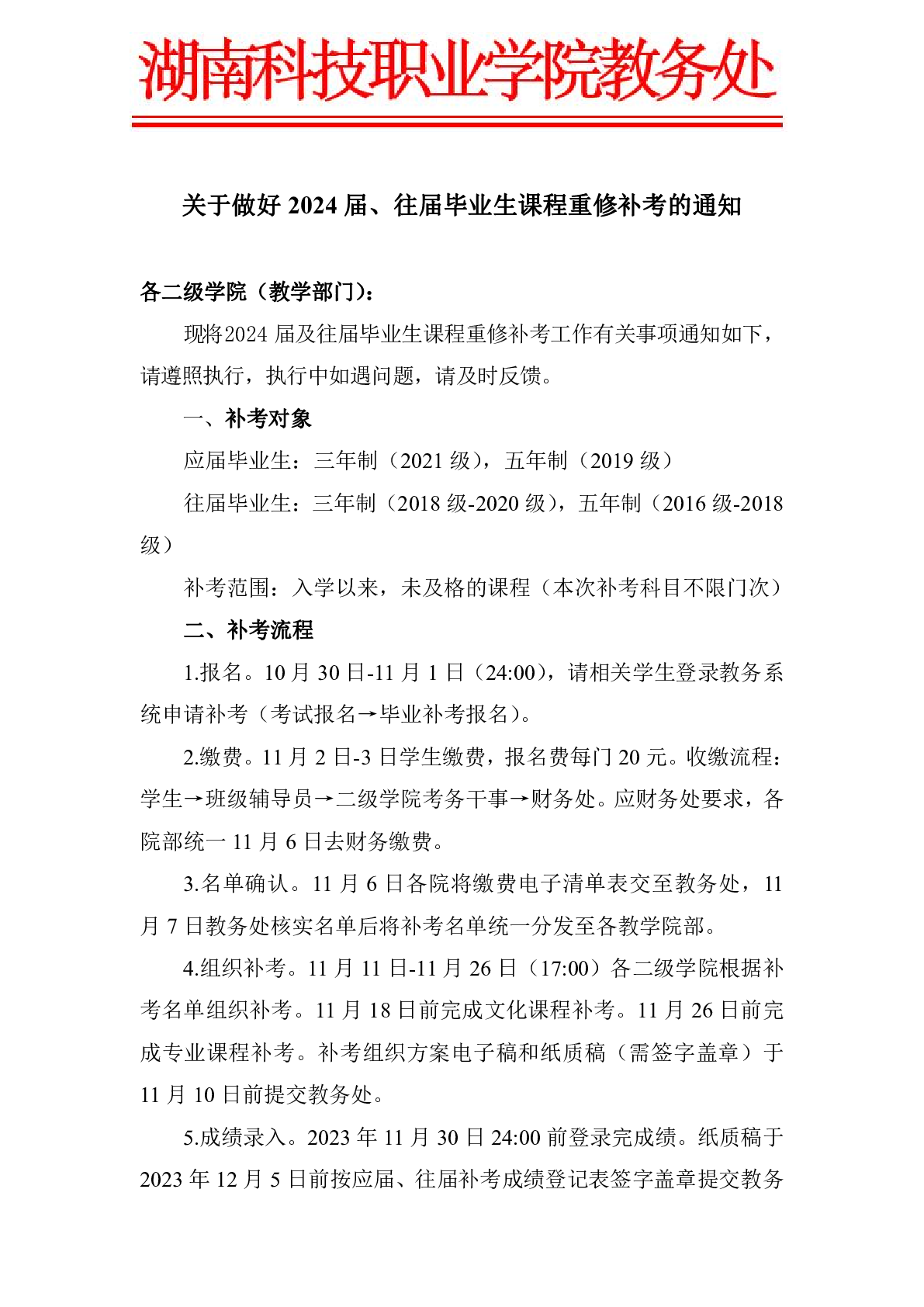 关于做好 2024 届、往届毕业生课程重修补考的通知