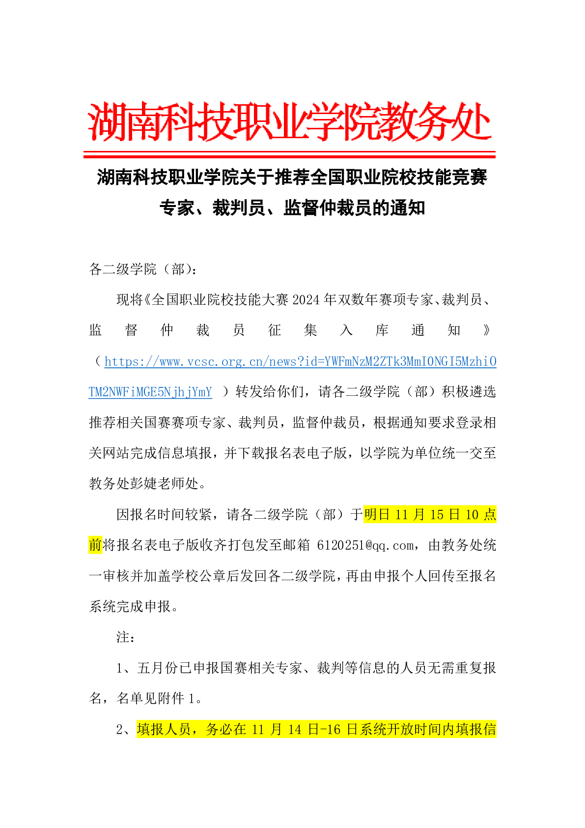 湖南科技职业学院关于推荐全国职业院校技能竞赛专家、裁判员、监督仲裁员的通知