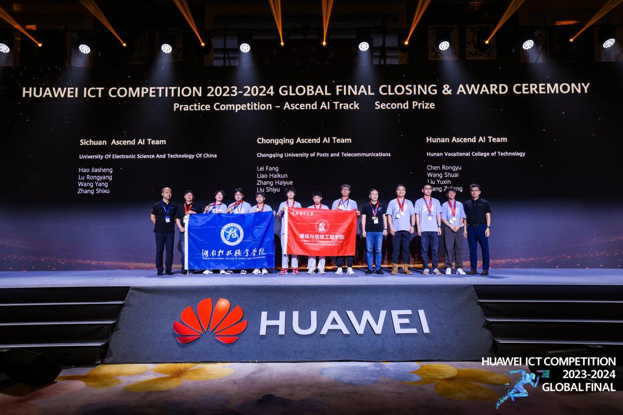 昇腾AI赛道是本次大赛的新增赛道,全球总决赛为本专科生同赛。经过全国赛的选拔,共有华中科技大学等5所本科学校代表队,湖南科技职业学院5所专科学校代表队闯入全球赛。在昇腾AI这个全新且富有挑战性的赛道上,我校人工智能学院学子王帅、刘宇鑫、向泽亮以全国赛专科组一等奖成绩闯入全球赛并勇夺二等奖(专科组第一名)。这一优异成绩,向全世界展现了我校对接产业办专业、“岗课赛证创融通”育人才所取得的成效。