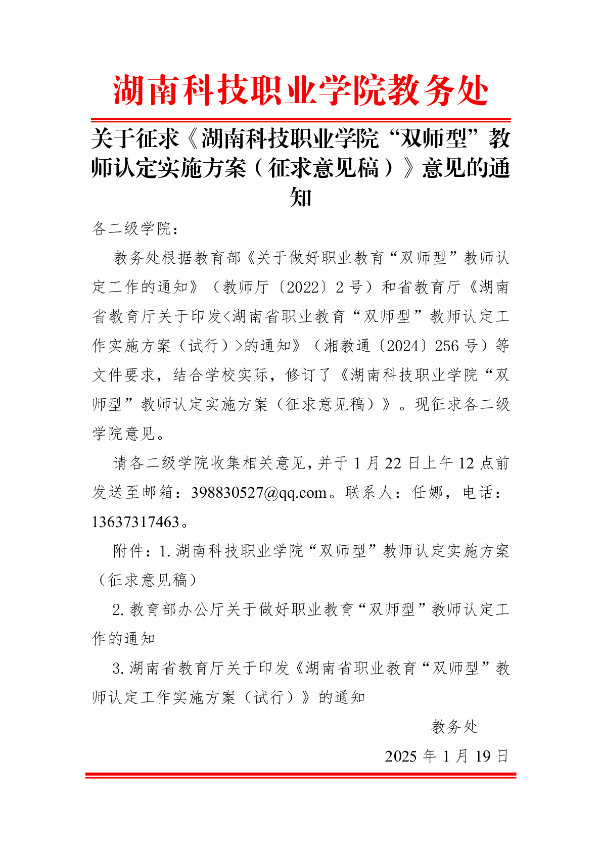 关于征求《湖南科技职业学院“双师型”教师认定实施方案(征求意见稿)》意见的通知
