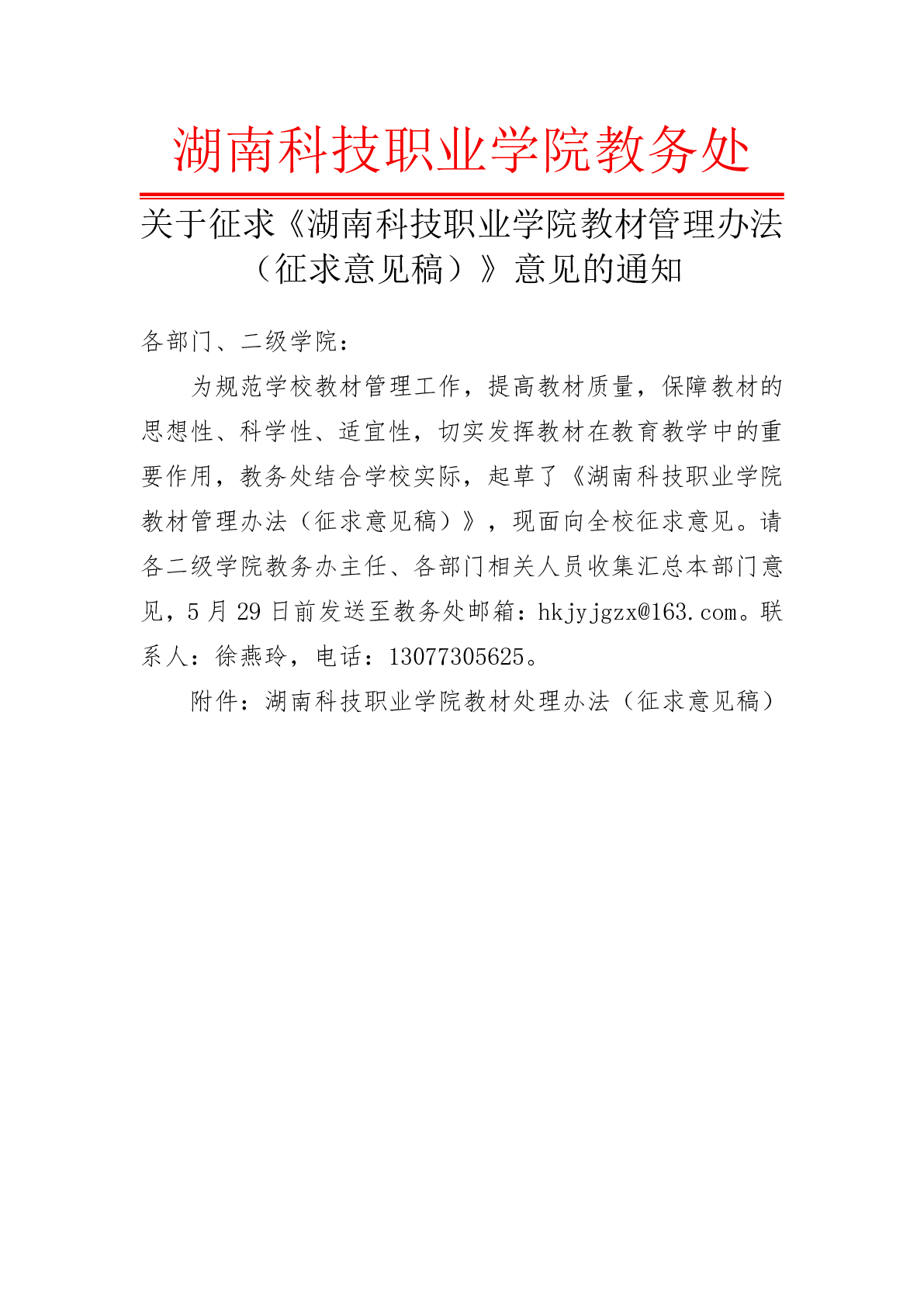 关于征求《湖南科技职业学院教材管理办法(征求意见稿)》意见的通知
