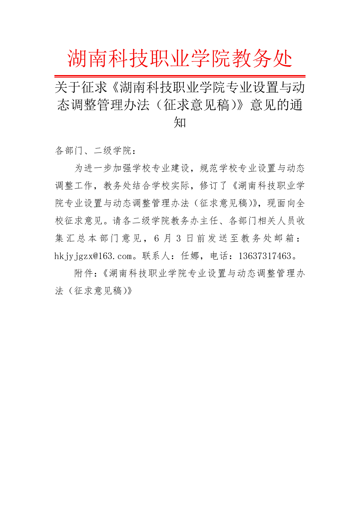 关于征求《湖南科技职业学院专业设置与动态调整管理办法(征求意见稿)》意见的通知