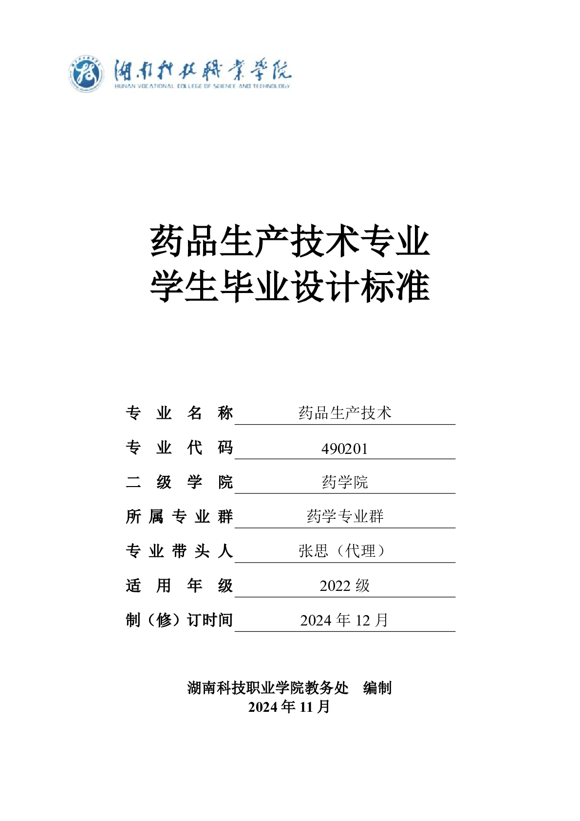 药学院药品质量与安全专业2025届学生毕业设计标准