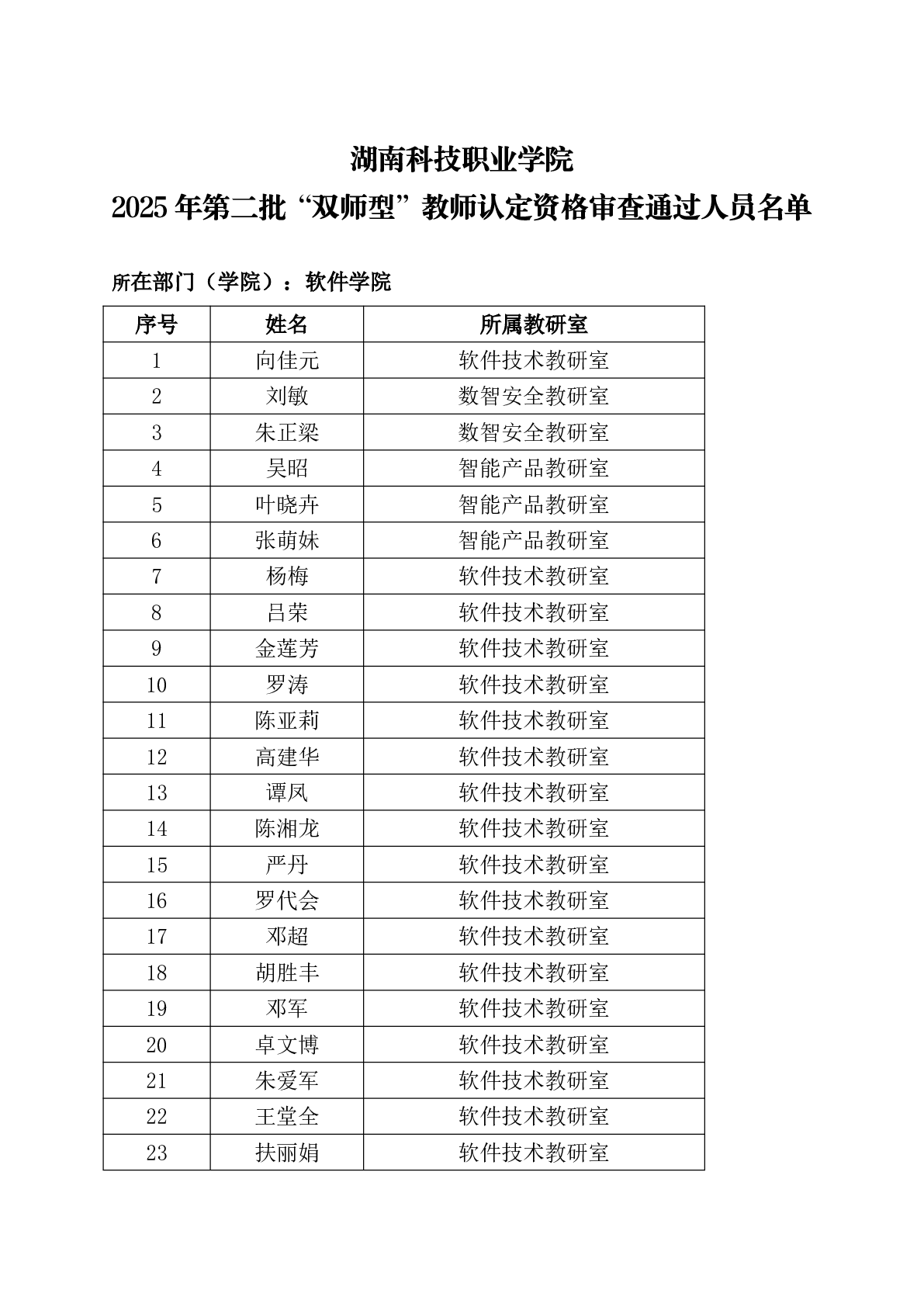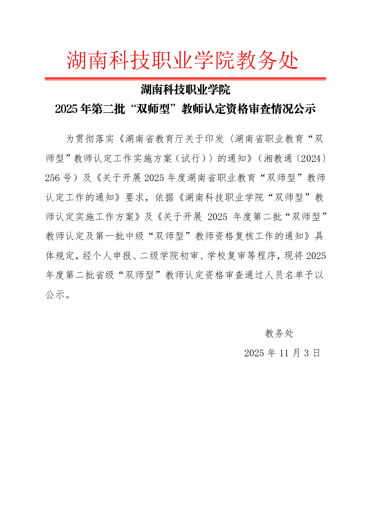 湖南科技职业学院 2025年第二批“双师型”教师认定资格审查情况公示