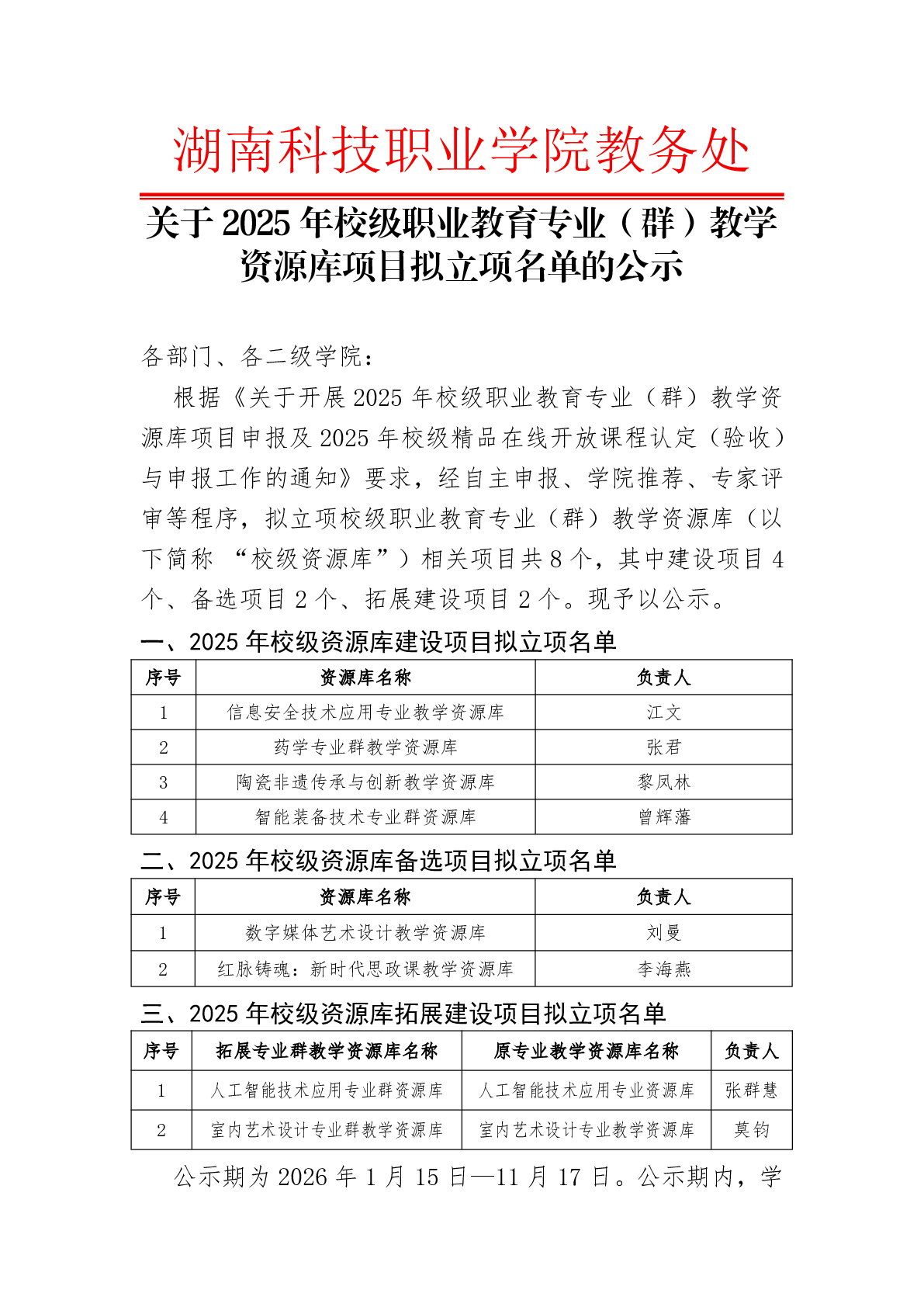 关于2025年校级职业教育专业(群)教学资源库项目拟立项名单的公示