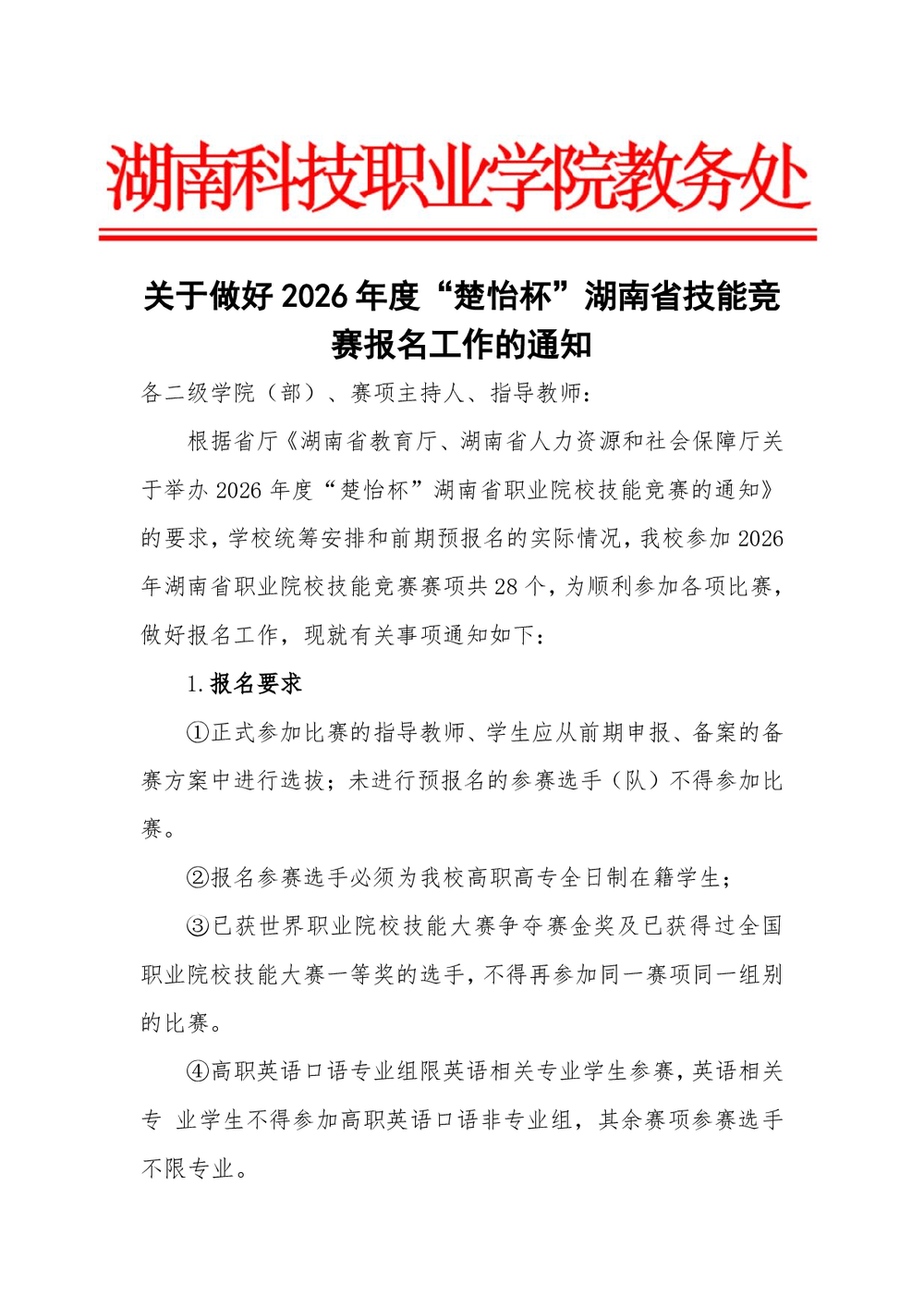 关于做好2026年度“楚怡杯”湖南省技能竞赛报名工作的通知