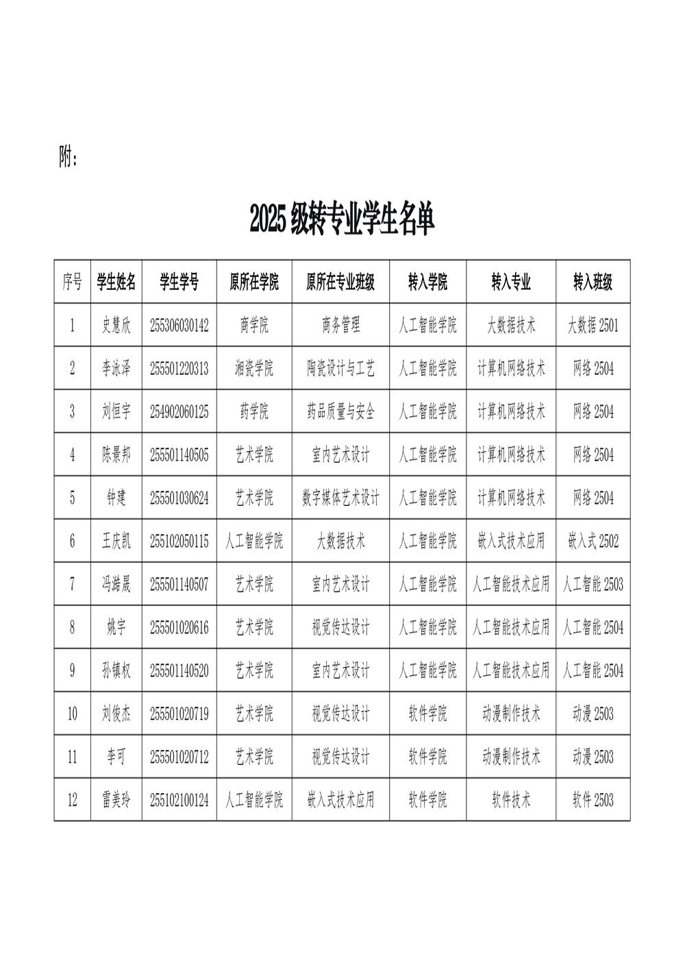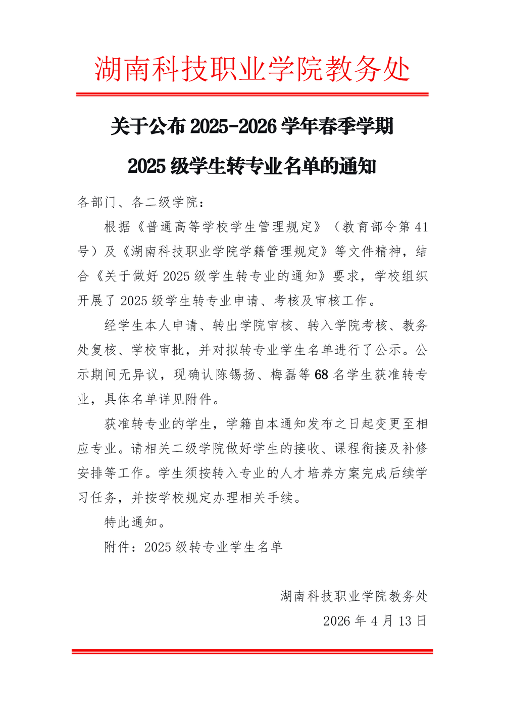 关于公布2025-2026学年春季学期2025级学生转专业名单的通知